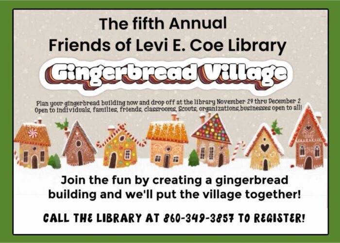 Plan your gingerbread building now and drop off at the library Saturday, November 29th through Tuesday, December 2nd. Open to all! Please call the library 860.349.3857 to register.