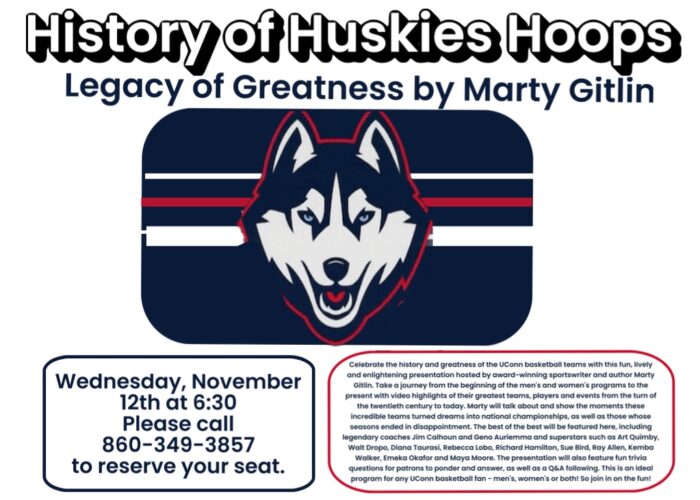 Join us Wednesday, November 12th at 6:30 PM. Registration required. Celebrate the history and greatness of the UConn basketball teams with this fun, lively and enlightening presentation hosted by award-winning sportswriter and author Marty Gitlin. Take a journey from the beginning of the men’s and women’s programs to the present with video highlights of their greatest Read more >